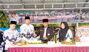 Pada kali ini, dalam gelar upacara bendera Hari Guru Nasional dan HUT PGRI ke-77 mengangkat tema “Serentak Berinovasi, Wujudkan Merdeka Belajar”.