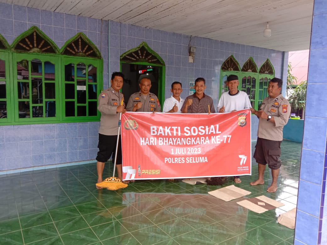 Talo, Globaltoday.id- Polres Seluma, Polsek Talo menggelar Bakti Sosial Religi dengan melakukan pembersihan masjid dalam rangka menyambut HUT Bhayangkara ke-77.