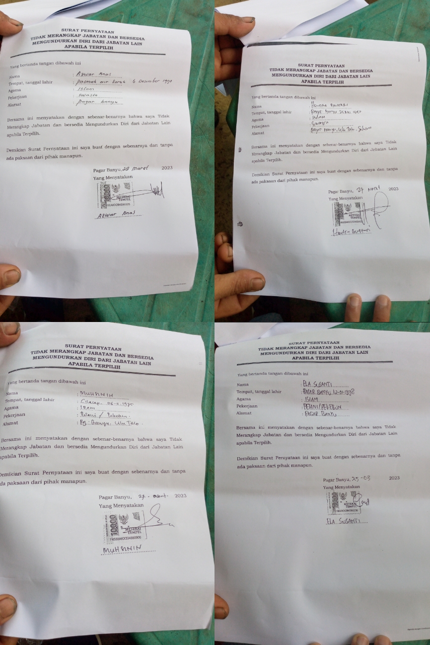 Diketahui sebelumnya, surat pernyataan yang telah dibuat dan ditandatangani menggunakan materai 10.000 serta disepakati oleh seluruh para peserta calon kepengurusan BPD Desa Pagar Banyu pada Selasa, (28/3/2023), akan tetapi surat pernyataan yang telah mereka buat sendiri dilanggar dan dikangkangi sendiri oleh mereka.