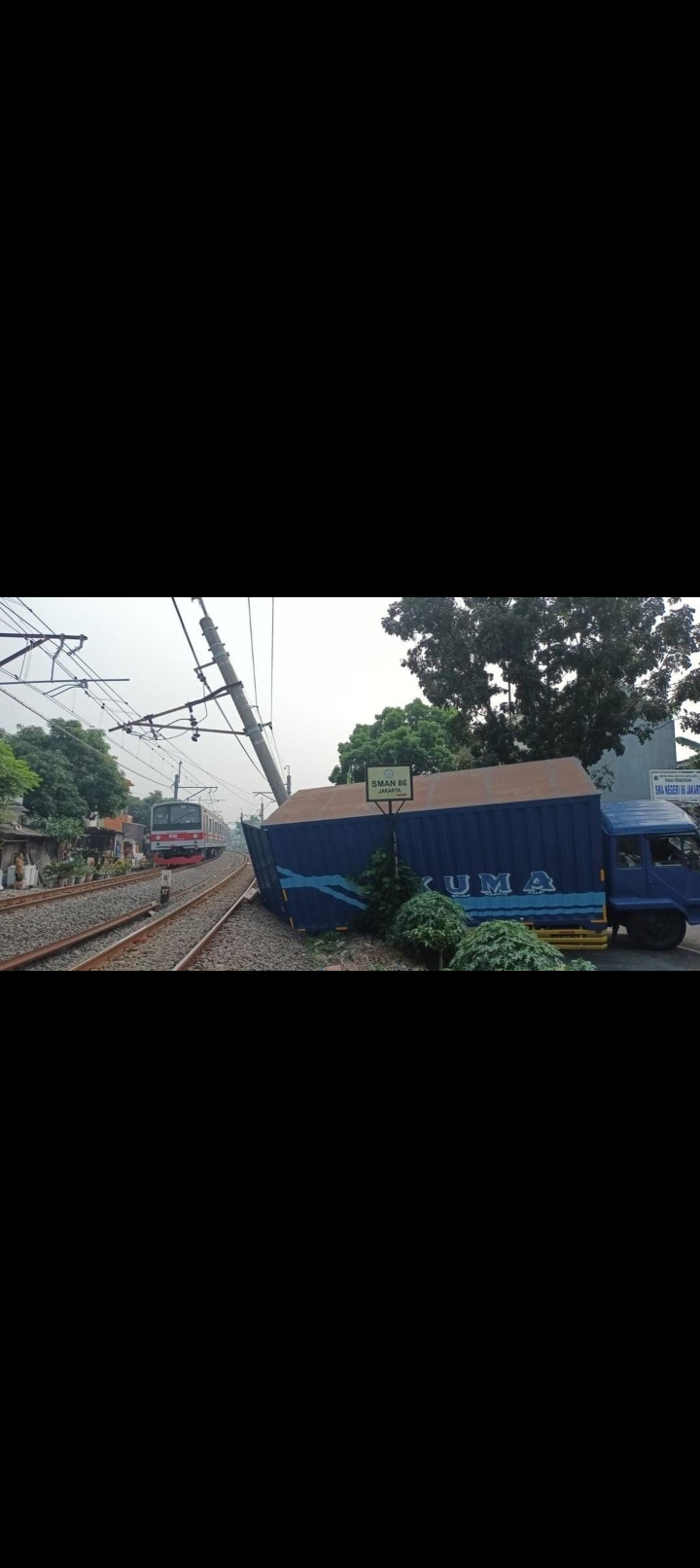 Nampak jelas dalam foto yang diunggah dimedia sosial, foto tersebut memperlihatkan tiang listrik miring ke arah rel kereta api yang menyebabkan perjalanan Kereta Rel Listrik (KRL) terganggu.