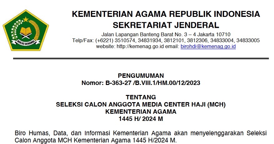 Kementerian Agama resmi membuka Lowongan Kerja untuk ditempatkan sebagai anggota media center Haji (MCH) 1445 Hijriyah/2024 Masehi.
