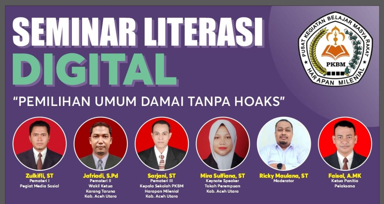 Aceh Utara, Globaltoday.id – Dalam rangka mewujudkan partisipasi masyarakat dalam mendukung tercapainya kesuksesan dan kedamaian Pemilu 2024, Komunitas Literasi Digital PKBM Harapan Milenial Kabupaten Aceh Utara menggelar Seminar Literasi Digital. Kegiatan yang berlangsung di Gedung SKB Kabupaten Aceh Utara, Sabtu (27/1/24) itu mengusung tema “Pemilu Damai Tanpa Hoaks”. Ratusan peserta seminar hadir, baik dari Kalangan Pemuda, Mahasiswa, Santri, Aparatur Desa, Orang Tua dari Siswa PKBM Harapan Milenial dan Masyarakat umum di Aceh Utara.