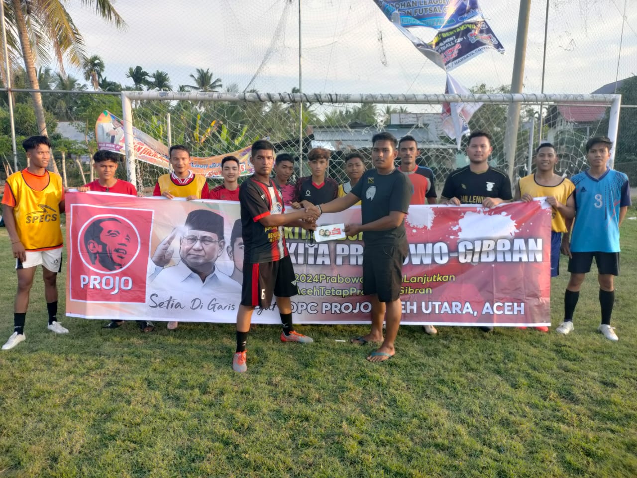 Aceh Utara, Globaltoday.id – Ormas Projo Kabupaten Aceh Utara bersama relawan menyerahkan bantuan sarana olahraga di Lapangan Bola Kaki Desa Alue Keujruen Kecamatan Tanah Luas Aceh Utara, Sabtu (10/02/2024) Sore.