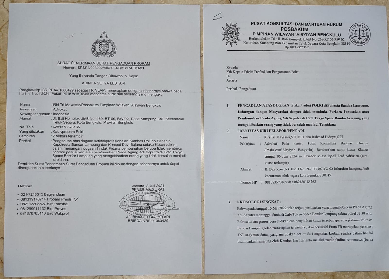 Sementara, didalam surat pengaduan atas dugaan pelanggaran kode etik profesi Polri di Polresta Bandar Lampung memaparkan kronologis singkat yaitu, bahwa pada Tanggal 15 Mei 2022 telah terjadi penusukan yang mengakibatkan Prada Agung Adi Saputra meninggal dunia di Tokyo Space Cafe. Dalam proses penyidikan dan penyelidikan kasus tersebut Aparat Kepolisian Polresta Bandar Lampung telah menetapkan 1 orang tersangka tunggal yakni Pratu F.R yang merupakan oknum personil anggota TNI AD.