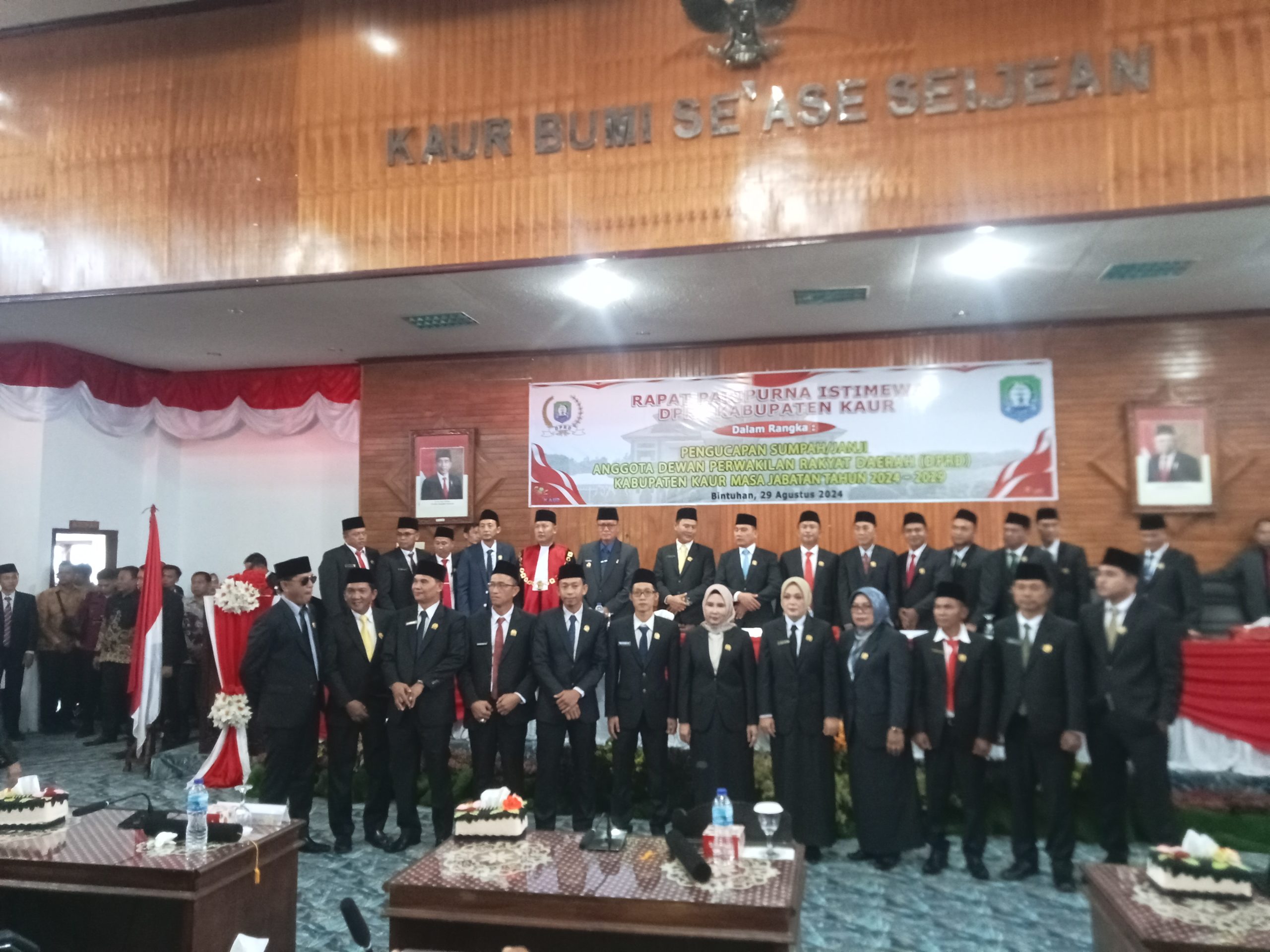 ” Acara Pelantikan DPRD Kabupaten Kaur Masa Bhakti 2024-2029 tersebut. Dihadiri Bupati Kaur H. Lismidianto, SH.,MH, Forkopemda, Sekda, Instansi Vertikal, Staf Ahli, Asisten, Sekwan, Kepala OPD, Direktur RSUD Kaur, Eselon ll, Kapolres Kaur, Kajari Kaur, Dandim, Camat Se-Kabupaten Kaur, Anggota DPRD, Pendamping Presedium, Organisasi.