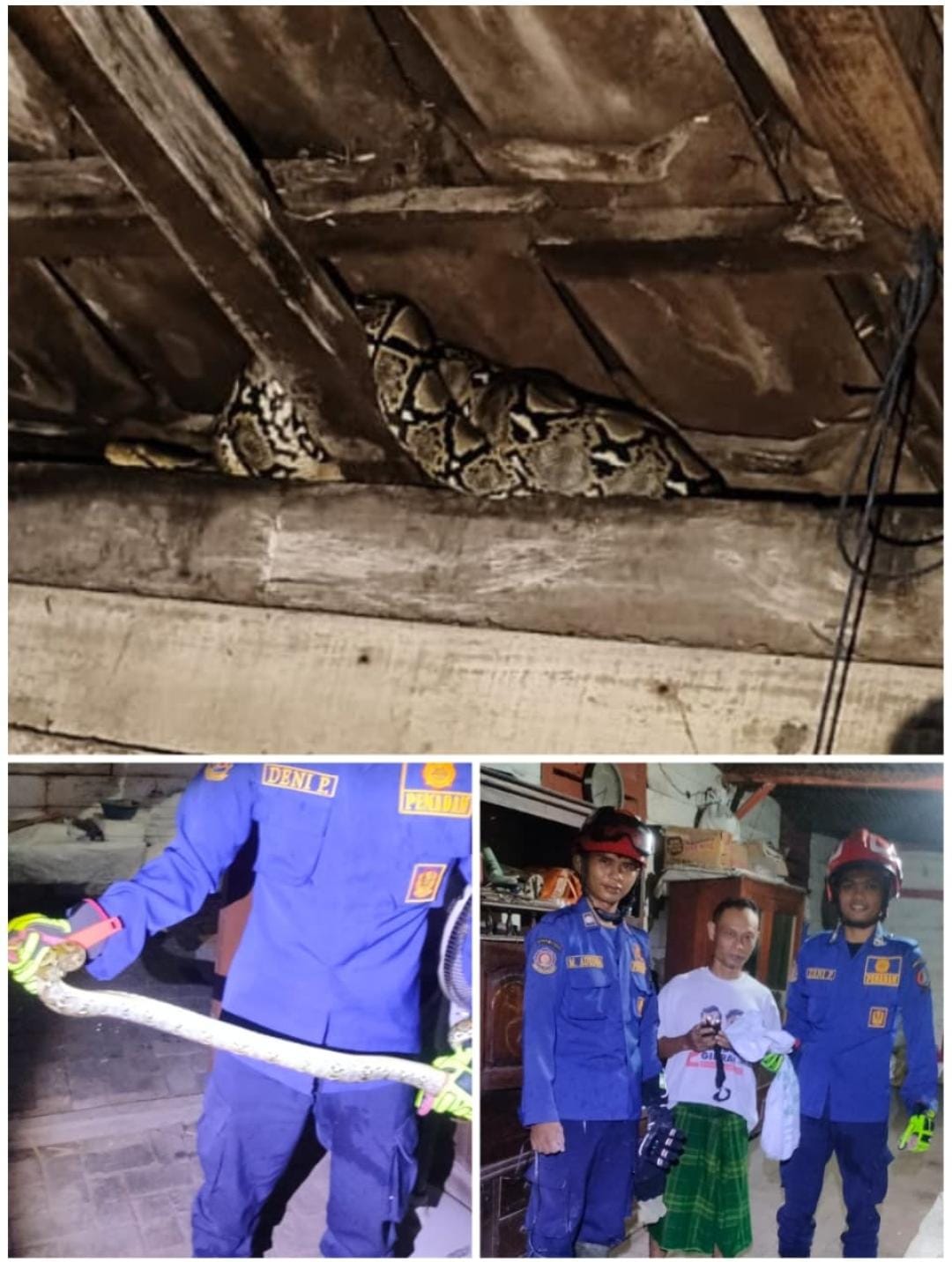 Globaltoday.id. Bojonegoro, 13/05/2025 Warga Dusun Bringan RT 13 Desa Ngraho Kecamatan Gayam gempar karena dihebohkan masuknya seekor ular sanca kembang (ulo sowo) sepanjang 1 meter di rumah warga bernama Surat sekira usai sholat magrib. Ular yang tidak diketahui asal usulnya tiba tiba sudah berada di bawah atap genting rumah. Sontak saja membuat penghuni rumah terkejut dan keluar rumah memberitahu tetangga karena kwatir terjadi satu hal yang tidak diinginkan.