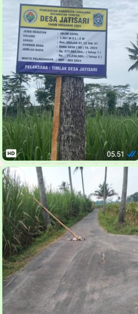 Globaltoday.id, Lumajang, 4 Juli 2025 – Proyek pembangunan jalan aspal di Desa Jatisari, Kecamatan Tempeh, Kabupaten Lumajang, menuai sorotan tajam dari berbagai pihak. Proyek senilai Rp. 348 juta yang bersumber dari Dana Desa (DD) Tahun Anggaran 2024 itu diduga menyalahi aturan karena tidak melalui proses lelang dan justru dikerjakan oleh Tim Pelaksana Kegiatan (Timlak) desa, dan terancam di audit oleh Inspektorat.