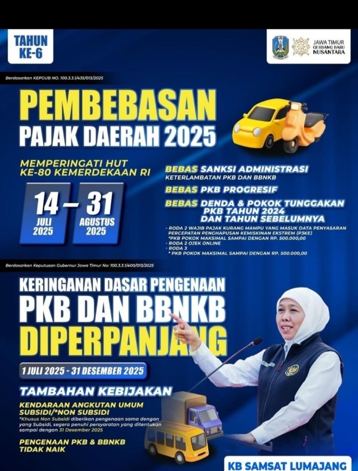 Globaltoday.id, Lumajang – Pemerintah Provinsi Jawa Timur kembali menghadirkan program Pembebasan Pajak Daerah tahun 2025 sebagai bentuk apresiasi terhadap masyarakat sekaligus dalam rangka memperingati Hari Ulang Tahun ke-80 Kemerdekaan Republik Indonesia. Program ini akan berlangsung mulai 14 Juli hingga 31 Agustus 2025 dan memasuki tahun pelaksanaan ke-6.