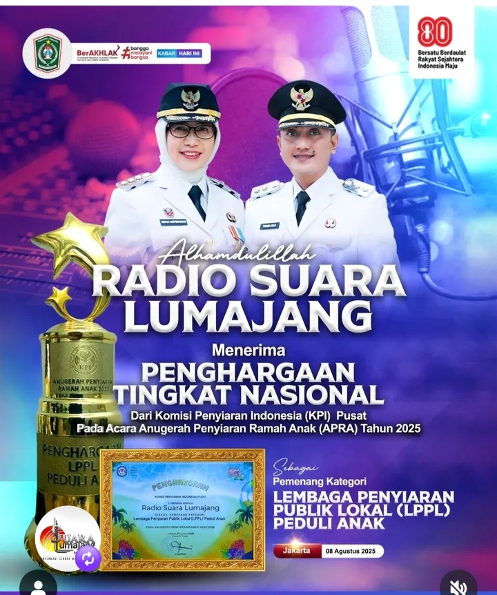 Globaltoday.id, Lumajang, 8 Agustus 2025 – Radio Suara Lumajang menorehkan prestasi membanggakan di kancah nasional dengan meraih penghargaan Lembaga Penyiaran Publik Lokal (LPPL) Peduli Anak pada ajang Anugerah Penyiaran Ramah Anak (APRA) 2025 yang digelar Komisi Penyiaran Indonesia (KPI) Pusat di Jakarta, Jumat (8/8).