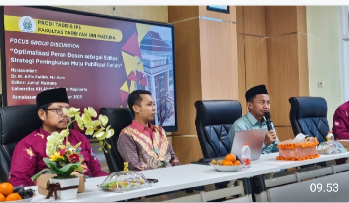 Globaltoday.id, PAMEKASAN – Program Studi Tadris Ilmu Pengetahuan Sosial (IPS) Universitas Islam Negeri (UIN) Madura terus menunjukkan komitmennya dalam memperkuat budaya akademik dan publikasi ilmiah. Salah satu langkah konkret diwujudkan melalui kegiatan Focus Group Discussion (FGD) bertajuk “Peningkatan Mutu Publikasi Ilmiah” yang digelar pada Kamis, 9 Oktober 2025, di ruang pertemuan Fakultas Tarbiyah. Kegiatan ini menghadirkan narasumber utama Dr. M. Alfin Fatikh, M.I.Kom, Editor Jurnal Nazruna: Jurnal Pendidikan Islam, yang telah berpengalaman dalam pengelolaan jurnal bereputasi nasional dan internasional.
