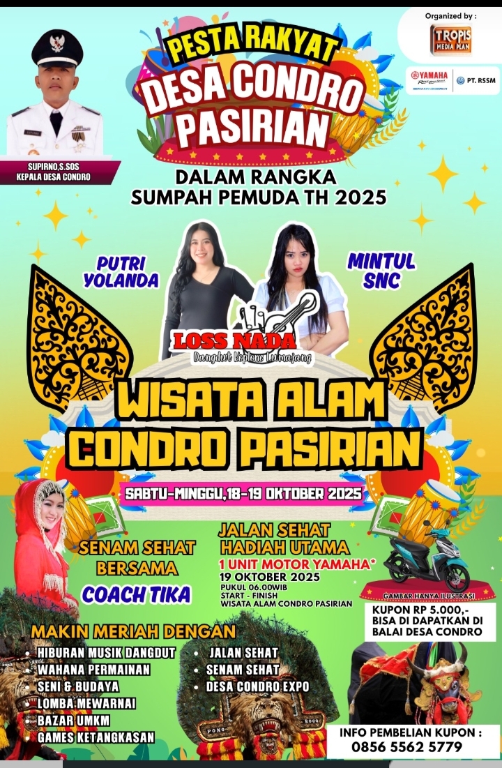 Globaltoday.id, Lumajang, 16 Oktober 2025 — Dalam rangka memperingati Hari Sumpah Pemuda Tahun 2025, Pemerintah Desa Condro, Kecamatan Pasirian, Kabupaten Lumajang, akan menggelar “Pesta Rakyat Desa Condro Pasirian” pada Sabtu–Minggu, 18–19 Oktober 2025 bertempat di Wisata Alam Condro Pasirian.