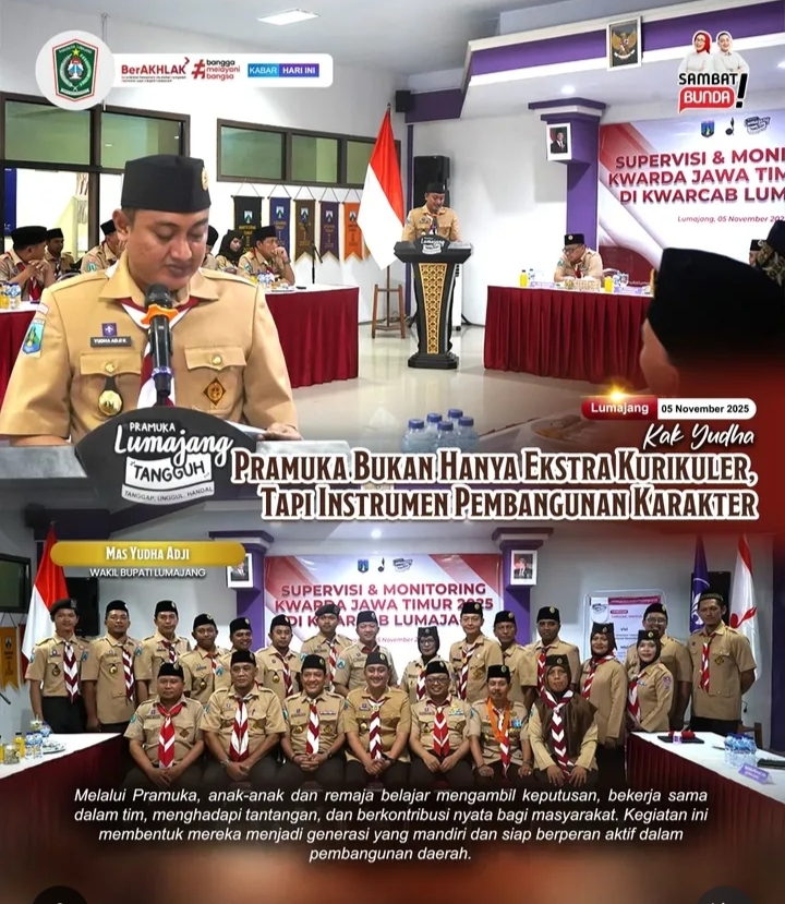 Globatoday.id, Lumajang — Ketua Kwartir Cabang (Kwarcab) Gerakan Pramuka Lumajang, Yudha Adji Kusuma, menegaskan bahwa Gerakan Pramuka bukan sekadar aktivitas ekstrakurikuler, melainkan instrumen strategis dalam membentuk karakter anak dan remaja di Lumajang. Hal tersebut disampaikannya saat menerima kunjungan supervisi dan monitoring dari Kwartir Daerah (Kwarda) Gerakan Pramuka Jawa Timur di Kwarcab Lumajang, Rabu (5/11/2025).