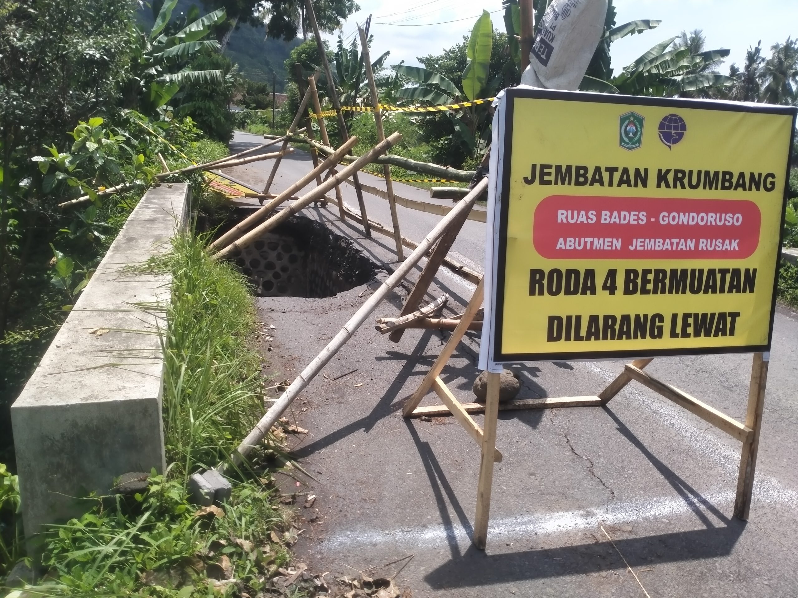 Pantauan di lapangan, lubang besar di sisi jembatan menyebabkan sebagian badan jalan amblas. Petugas memasang pagar bambu dan papan peringatan bertuliskan larangan melintas bagi kendaraan roda empat bermuatan berat, guna mencegah kerusakan lebih lanjut dan menghindari kecelakaan.