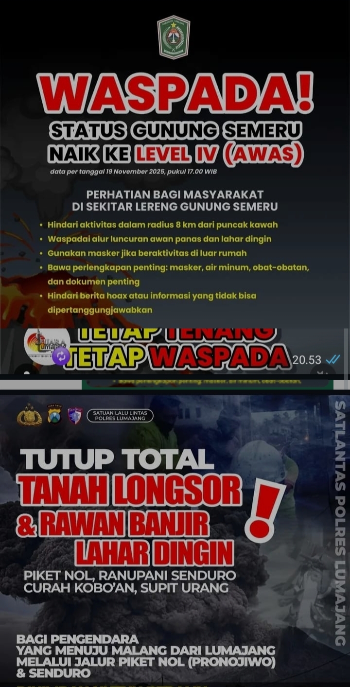 “Jagalah ketenangan, namun tetap waspada. Pastikan seluruh informasi yang diterima berasal dari kanal resmi pemerintah,” demikian imbauan yang disampaikan melalui akun resmi Pemkab Lumajang.