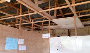 Tidak hanya kondisi atap yang nyaris ambruk, Ketika hujan turun para siswa harus belajar ditengah guyuran hujan akibat atap yang bocor.