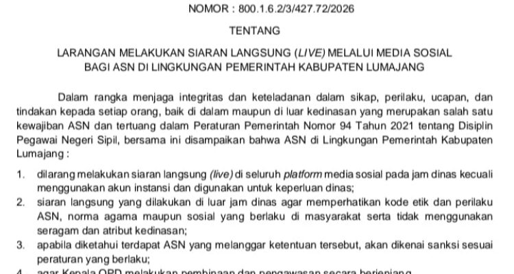 Pemkab Lumajang Larang ASN Siaran Langsung di Medsos Saat Jam Dinas