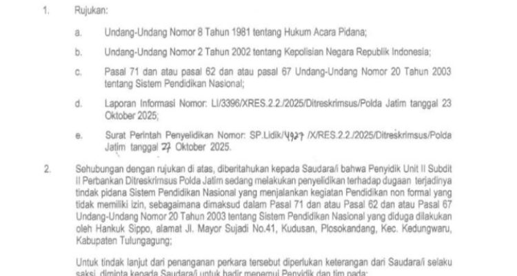 Polda Jatim Panggil LPNF Hankuk Sippo Tulungagung Gawat!Polda Jatim Panggil Pimpinan Lembaga Pendidikan di Tulungagung, Diduga Jalankan Kursus Ilegal Tanpa Izin Operasional Jawa Timur, Lumajang|Oktober 28, 2025oleh Tim Redaksi Globaltoday.id, Surabaya — Direktorat Reserse Kriminal Khusus (Ditreskrimsus) Polda Jawa Timur resmi